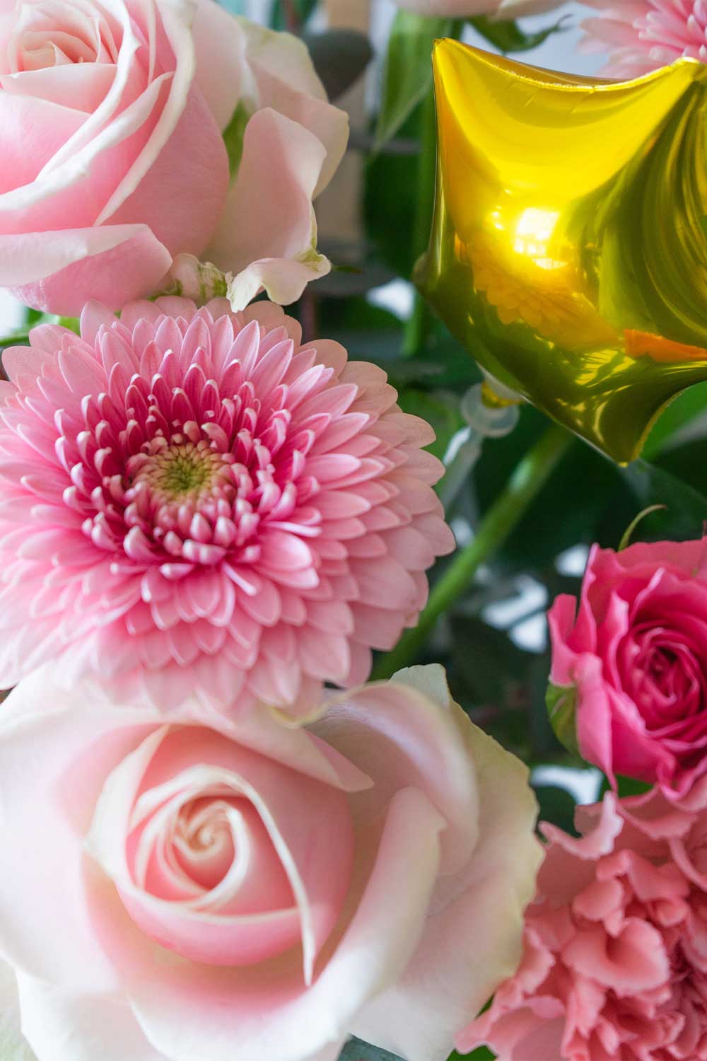 スタンド花の雰囲気があるスタンド付きのアレンジメントに、可愛いバルーンをつけました。