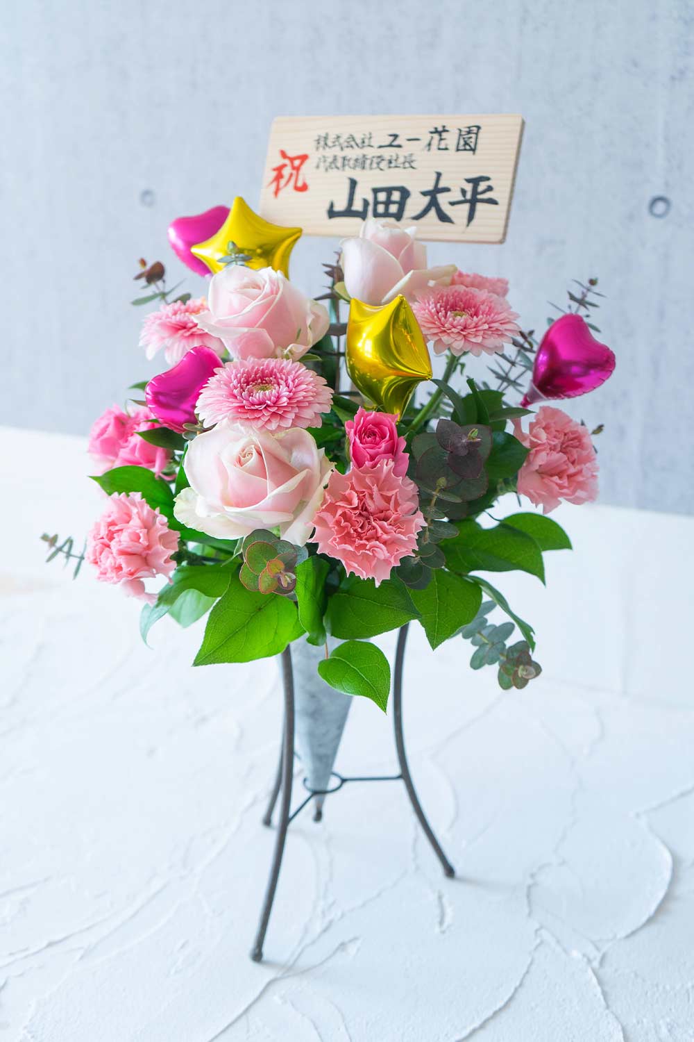 スタンド花の雰囲気があるスタンド付きのアレンジメントに、可愛いバルーンをつけました。